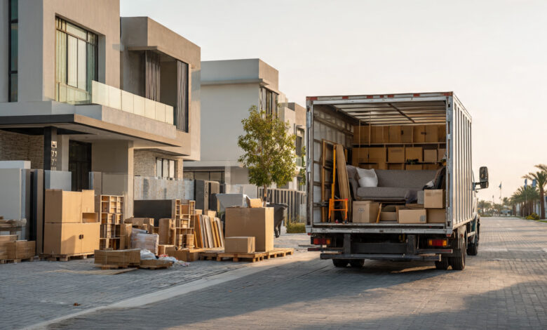 تتحرك السيارة إلى الموقع الجديد مع تثبيت الأثاث بشكل جيد.